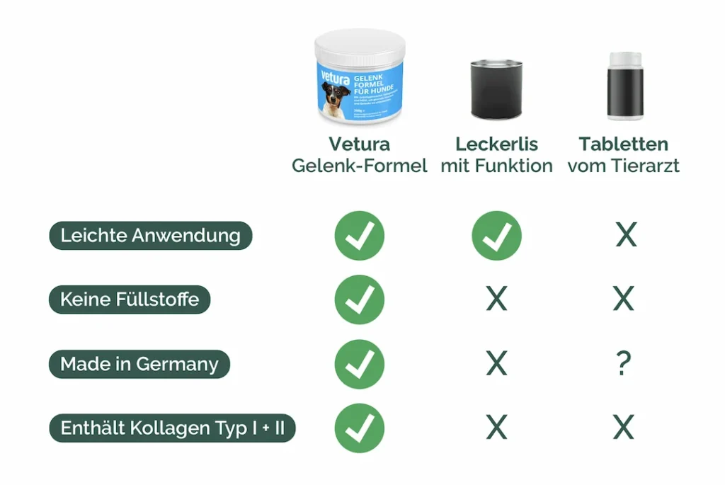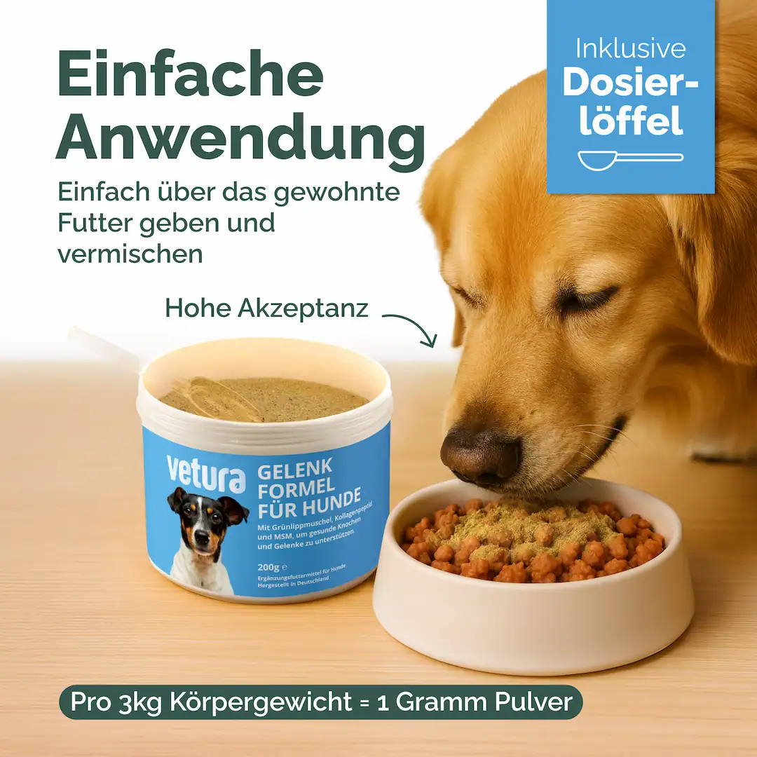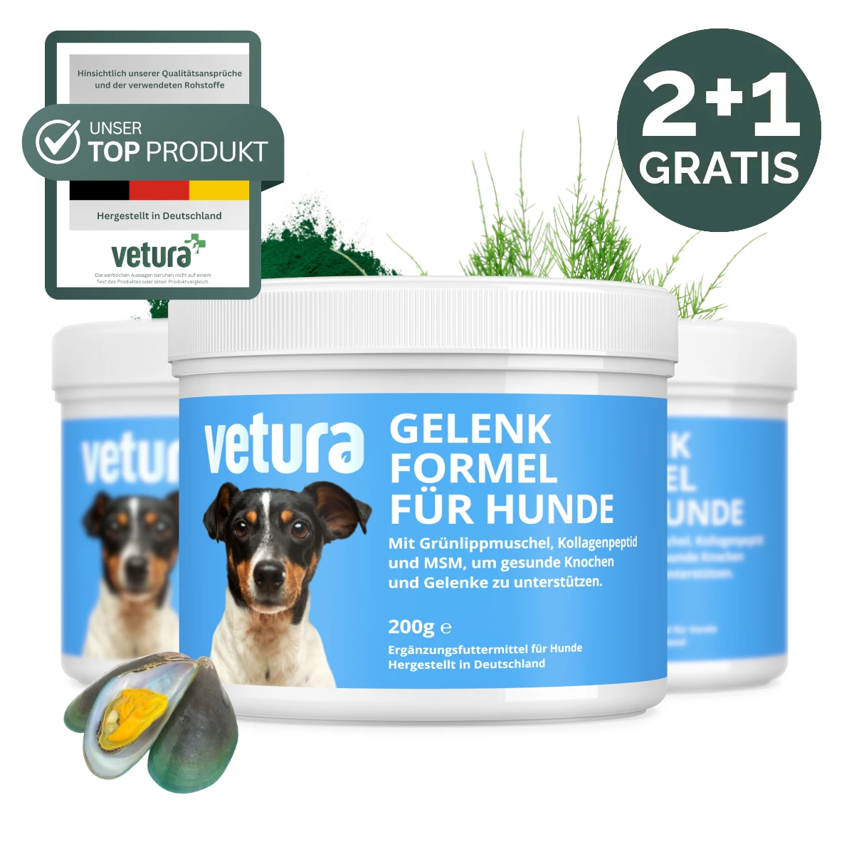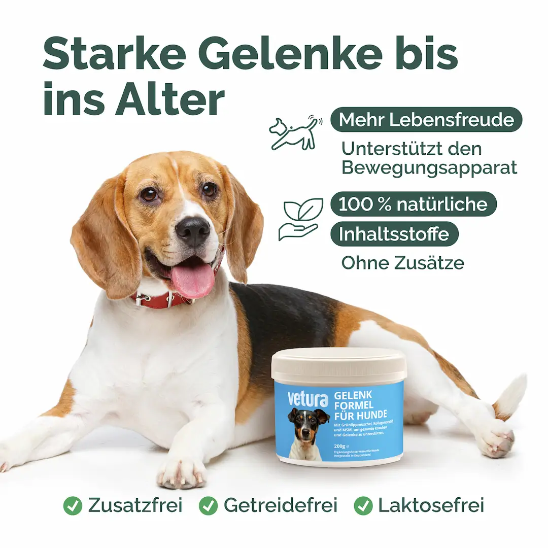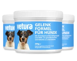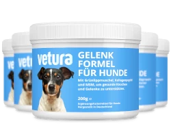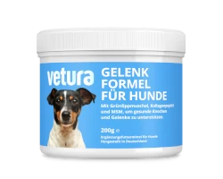 Unsere Gelenk-Formel von Vetura vereint bewährte Inhaltsstoffe, die speziell entwickelt wurden, um die Gelenkgesundheit deines Hundes auf natürliche Weise zu unterstützen – sowohl vorbeugend als auch bei bestehenden Beschwerden.