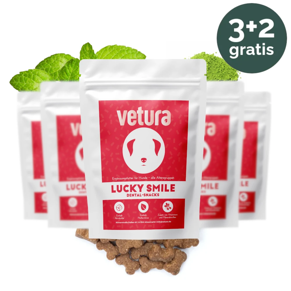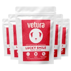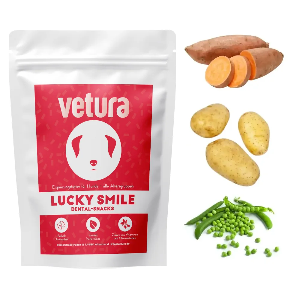 Unseren leckeren Lucky Smile Zahnpflege Leckerlis enthalten alles, was eine gesunde Hunde-Schnauze braucht. Mit natürlichen Zutaten unterstützen sie starke Zähne, reduzieren Zahnstein und verleihen einen frischen Atem. – Frei von Konservierungsstoffen, Farbstoffen, Geschmacksverstärker, Getreide, Gluten und Gen-Technik.