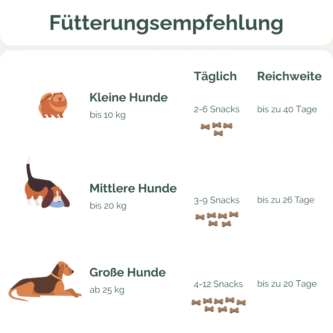 Die Snacks sind für jede Lebensphase geeignet – ganz egal, ob dein Hund noch Welpe ist oder bereits ein Senior.