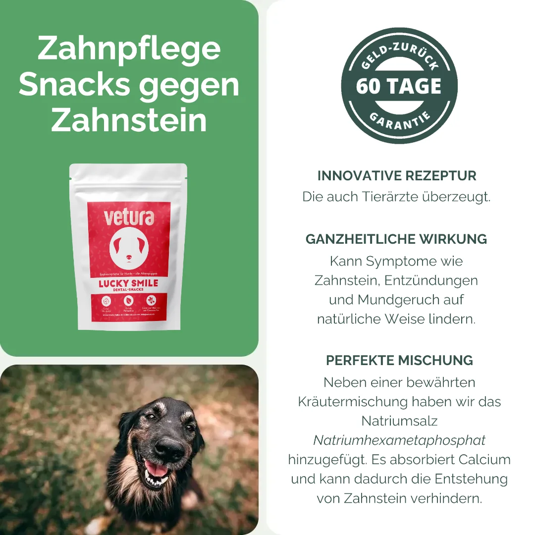 Zahnstein ist eines der häufigsten Probleme bei Hunden und kann zu schmerzhaften Entzündungen, Zahnverlust und schlechtem Atem führen. Mit Lucky Smile™ Zahnpflege-Snacks gibt es jetzt einen leckeren Kauartikel gegen Zahnstein für Hunde, der nicht nur schmeckt, sondern auch wirkt.