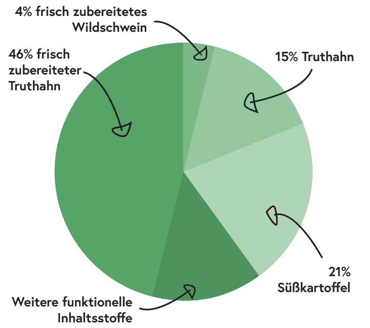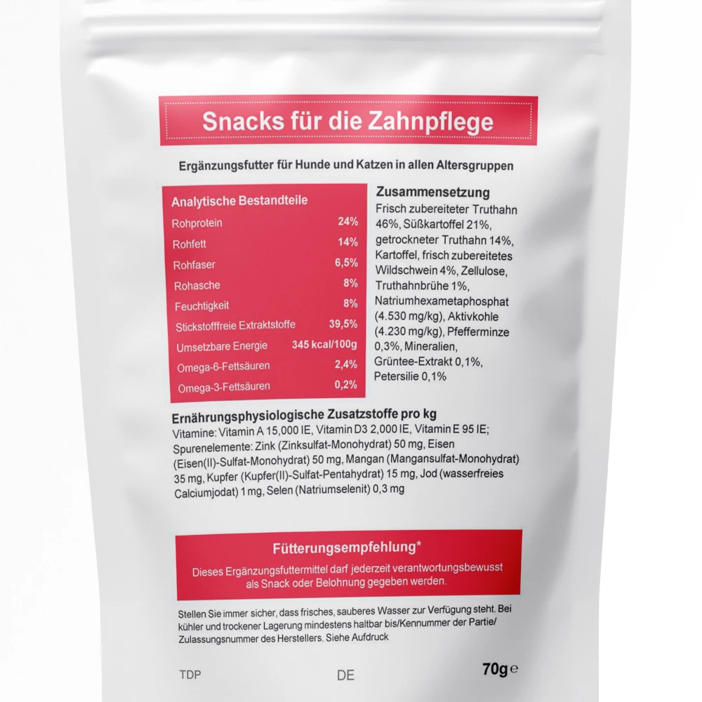 Unsere Zahnpflege Snacks für Hunde bestehen aus hochwertigen Proteinquellen und enthalten kein Getreide, Soja, Mais, Milch, Eier oder künstliche Zusatzstoffe und sind daher auch für allergische Hunde geeignet. Wir verwenden dafür frisch zubereiteten Truthahn und Wildschwein mit Süßkartoffel, was es für den Hund besonders schmackhaft macht.
