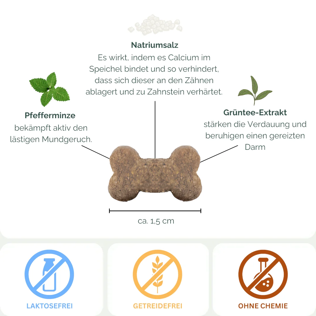 Natürlicher Grüntee-Extrakt wurde hinzugefügt, da er die Bakterien reduziert, die für schlechte Maulgesundheit verantwortlich sind. Pfefferminze bekämpft aktiv den lästigen Mundgeruch.