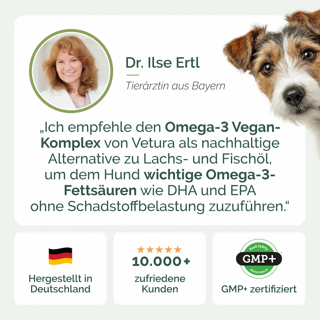 „Ich empfehle den Omega-3 Vegankomplex von Vetura als nachhaltige Alternative zu Lachs- und Fischöl, um dem Hund wichtige Omega-3-Fettsäuren wie DHA und EPA ohne Schadstoffbelastung zuzuführen.“