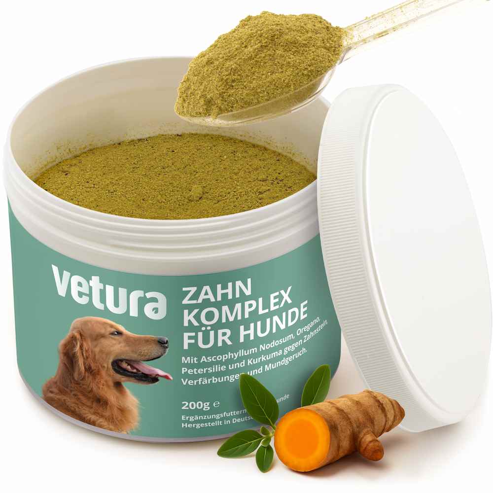 Für die tägliche Unterstützung der Zahngesundheit empfehle ich den Zahn-Komplex von Vetura. Das Pulver mit Ascophyllum nodosum (Seealge) und dem Postbiotikum L. plantarum CECT 9161 wirkt über den Speichel im gesamten Maulraum – es weicht Belag auf, bevor er zu hartem Zahnstein wird, und sorgt für eine gesunde Maulflora. Kombiniert mit gelegentlichen Kausnacks oder der Zahnbürste ist es die effektivste tägliche Grundlage für gesunde Hundezähne.