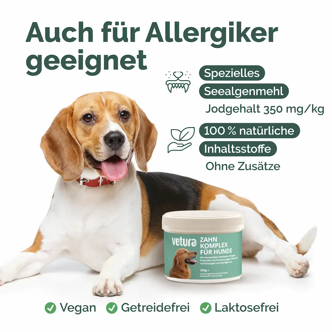 Darüber hinaus ist unser Zahn-Komplex vegan und enthält keine tierischen Proteine. Dadurch ist er auch für Hunde mit Futtermittelallergien und Unverträglichkeiten geeignet.