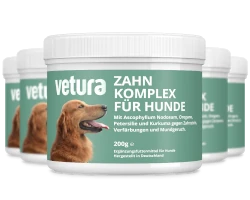 Besonders bewährt hat sich die Seealge Ascophyllum nodosum. Ihre Enzyme wirken systemisch und können die Plaque-Bildung reduzieren.¹ Unser Zahn-Komplex von Vetura besteht aus einer hochwertigen Kombination natürlicher Inhaltsstoffe wie Algen, Kräutern und Kurkuma, die gezielt dafür ausgewählt wurden, Zahnstein zu reduzieren, Mundgeruch zu bekämpfen und die Zahnhygiene deines Hundes zu fördern. Da es einfach über das Futter gegeben wird, lässt sich die Zahnpflege unkompliziert in den Alltag integrieren.